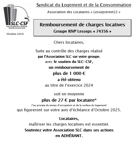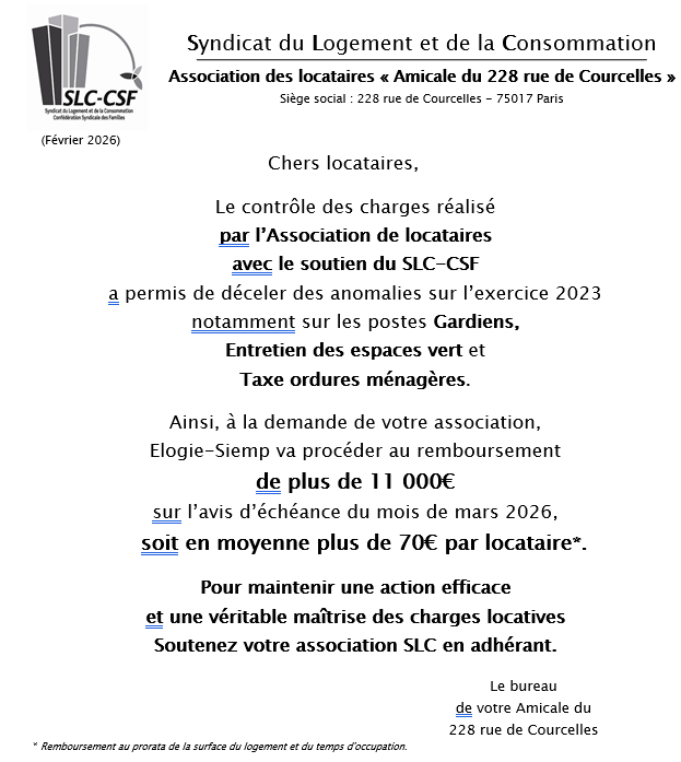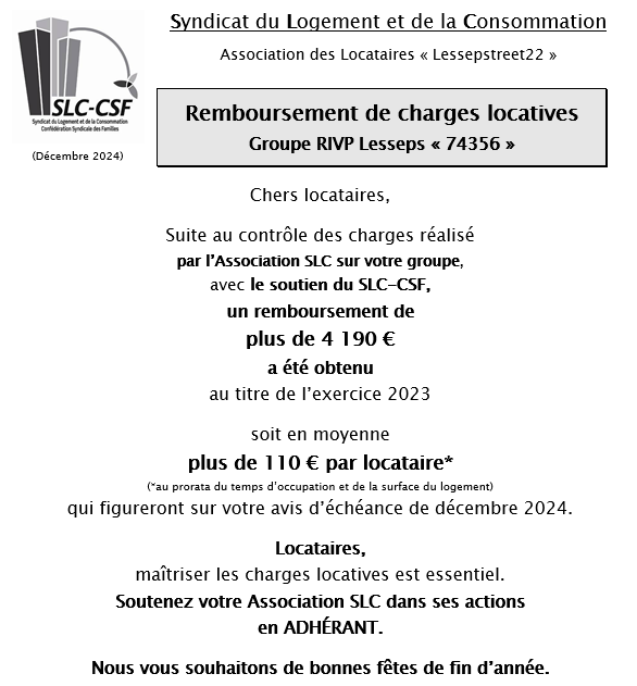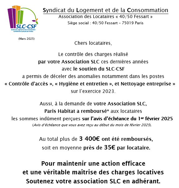 Régulièrement des anomalies sont relevées lors du contrôle des charges, et le SLC-CSF en informe le bailleur pour exiger les remboursements des charges indûment payées par les locataires. Si le montant des remboursements est conséquent (plusieurs dizaines d’euros par locataire), le remboursement apparaîtra sur l’avis d’échéance des locataires. Sinon, ces remboursements sont intégrés directement dans la régularisation de charges de l’exercice suivant, qui seront ainsi moins élevés. Vous trouverez ci-dessous des exemples d’information (diffusée par le SLC) aux locataires concernés par des remboursements.