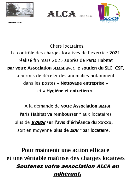 Remboursement de charges Groupe Paris Habitat ALCA 2025