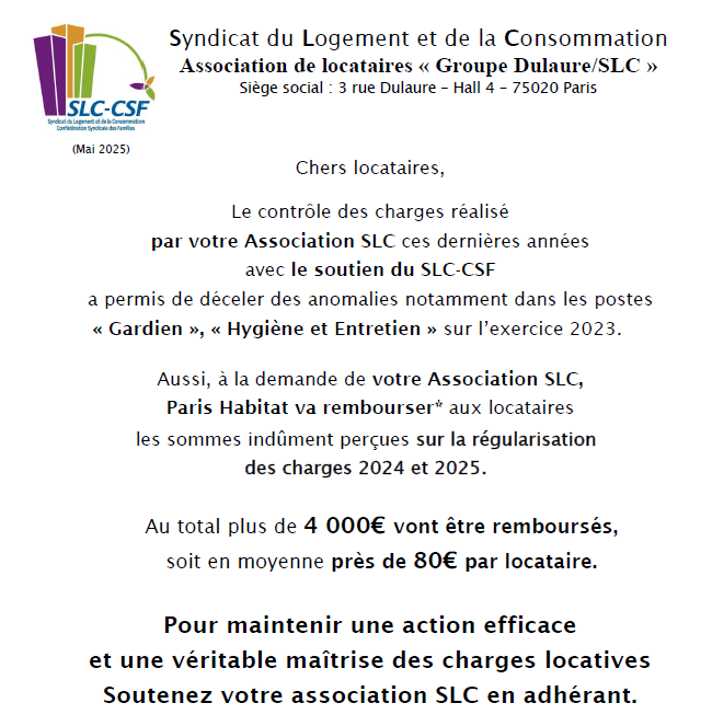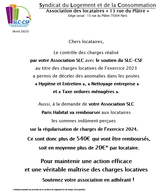 Remboursement de charges Groupe Paris Habitat Platre 2025