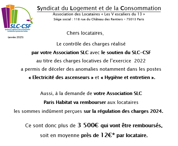 Remboursement de charges Groupe Paris Habitat Escaliers du XIII 2025