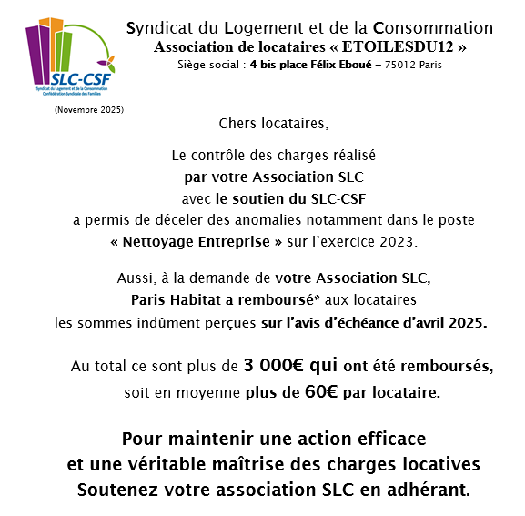 Remboursement de charges Groupe Paris Habitat Eoiles du 12 2025