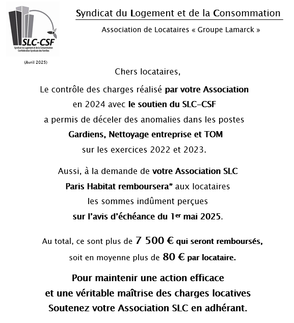 Remboursement de charges Groupe Paris Habitat Lamarck 2025